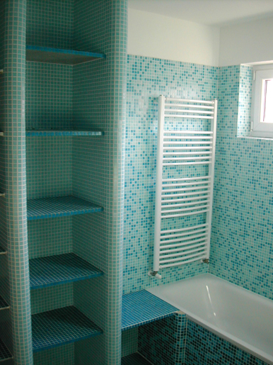 A burkolólapból készített polcok is üvegmozaik burkolatot kaptak. Így természetes anyagokból egyedi „fürdőszoba bútort” kaptunk.