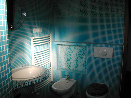 A mosdópult és a WC és bidé körüli részek is ívesek. A különböző színű üvegmozaikok kombinálásával különleges hatást érhetünk el.